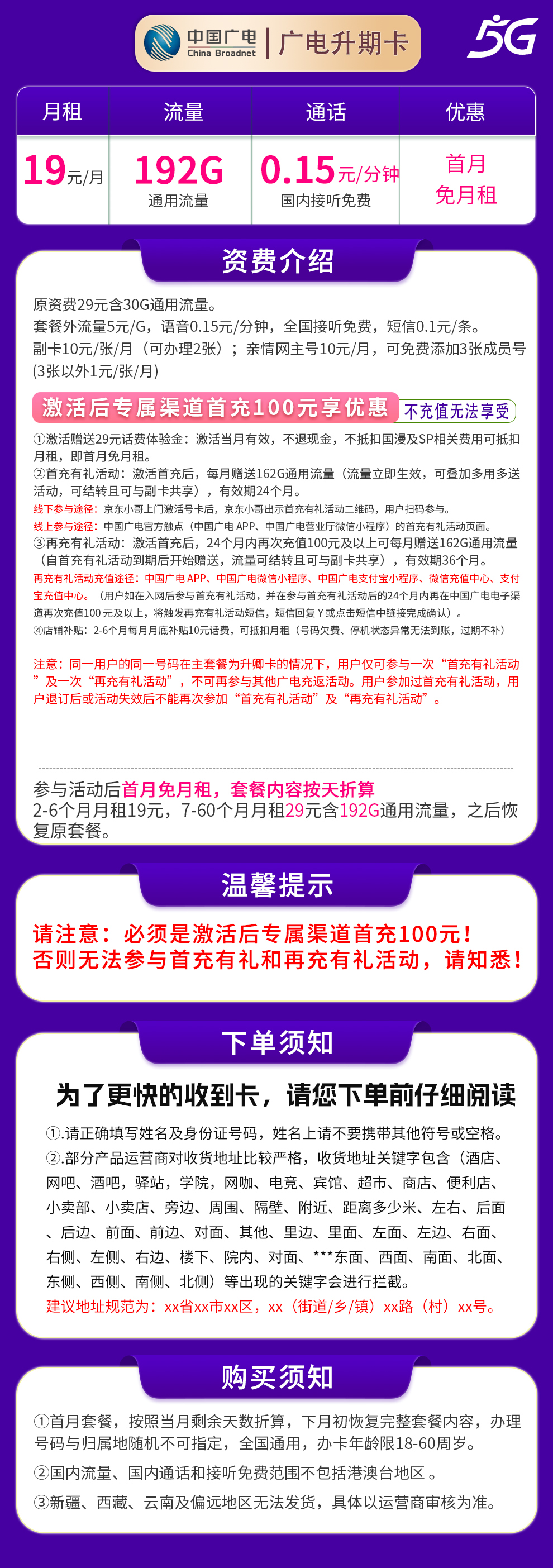 2-6个月月租19元,7-60个月月租29元含192G通用流量,之后恢复原套餐。