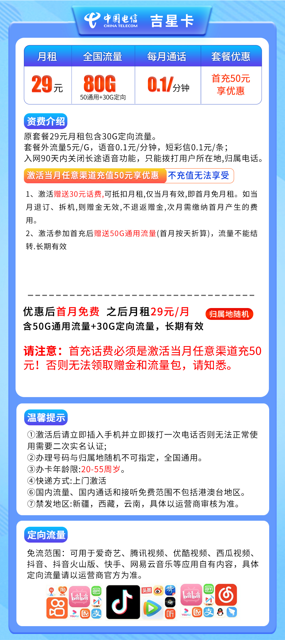 - 29元月租,首月免费,次月起每月50G通用流量+30G定向流量,长期有效。激活后需充值50元,前90天不能打长途电话,之后可取消限制。在网90天后再送100G通用流量,变成每月180G,但送的流量当月有效,不能结转。