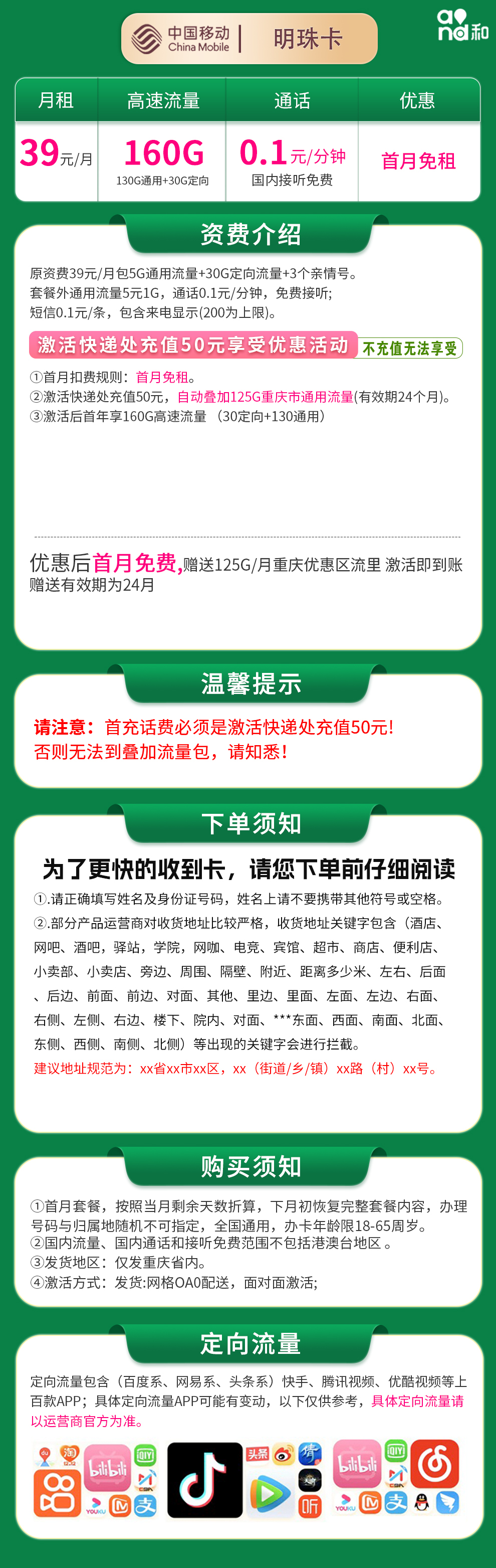 移动明珠卡39元160G【只发重庆】