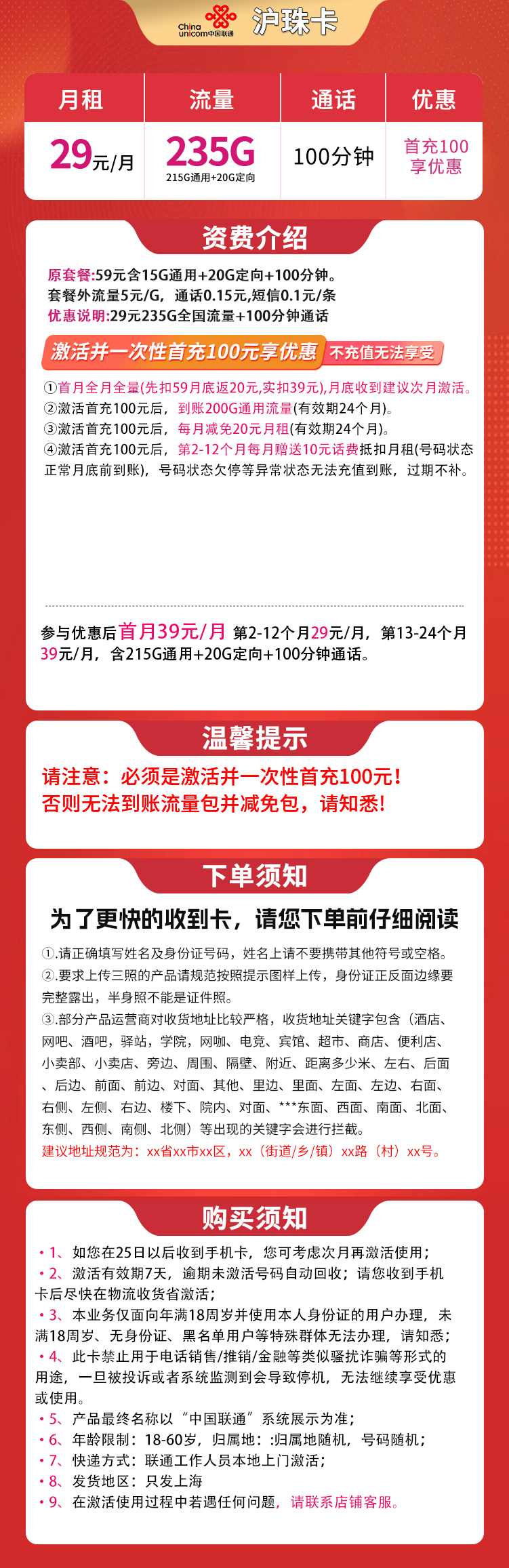 MF联通沪珠卡29元235G+100分钟【只发上海】