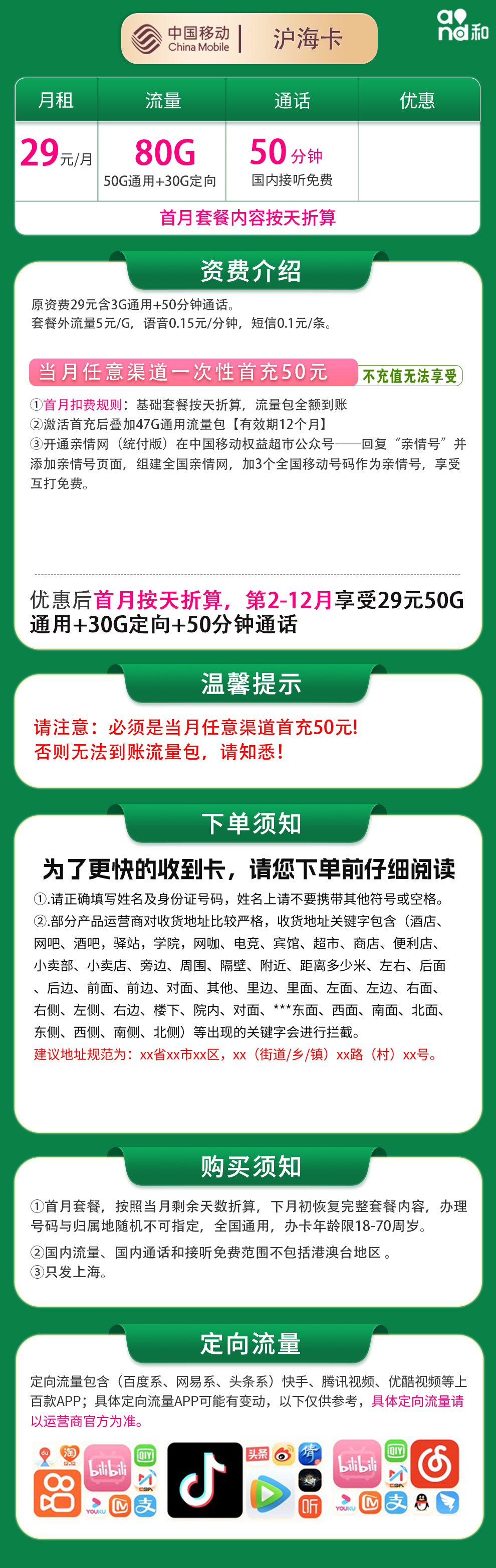 移动沪海卡29元80G+50分钟【只发上海】