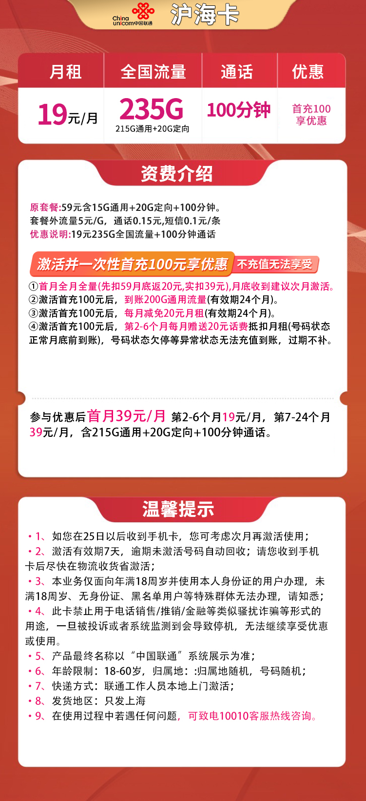 - 上海联通19元套餐:首月充值100元,得200G通用流量+100分钟通话,有效期2年。首月实付39元,第2-6个月每月19元,第7-24个月每月39元。每月共235G流量(215G通用+20G定向)+100分钟通话。