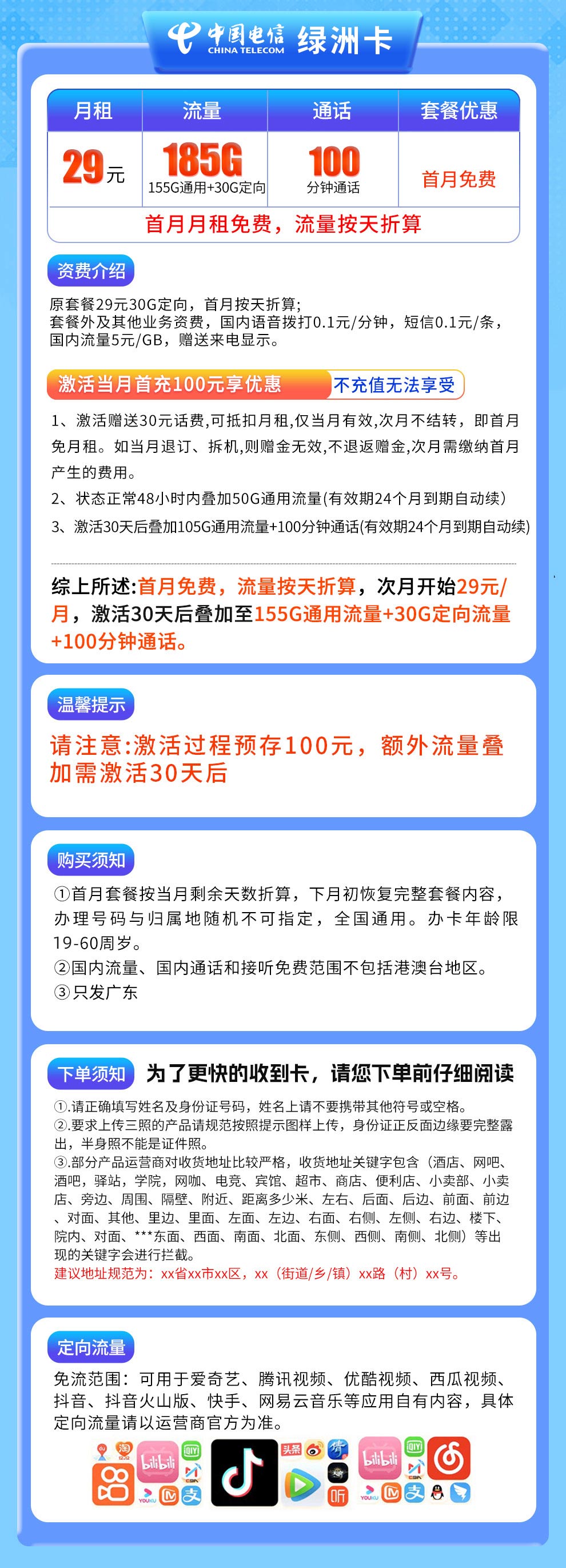 次月开始29元/月,激活30天后叠加至155G通用流量+30G定向流量+100分钟 - 定向流量: