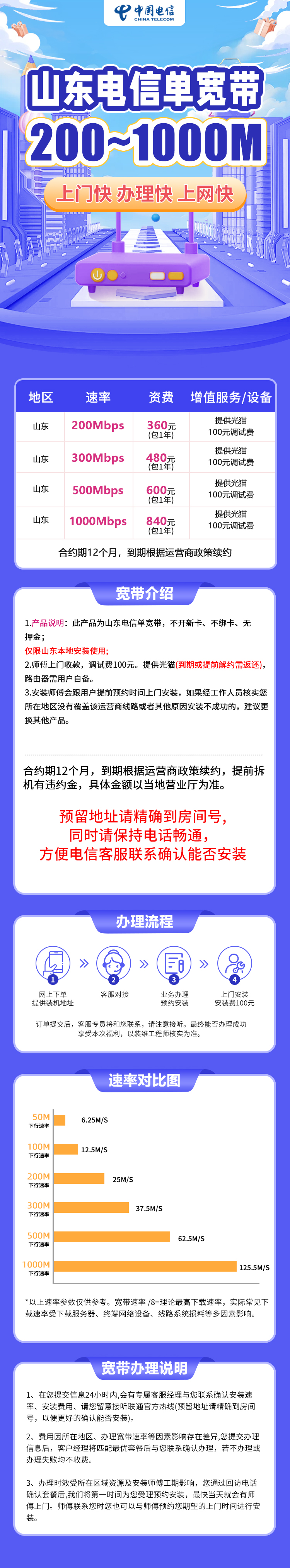 1.产品说明:此产品为山东全省电信单宽带,不开新卡、不绑卡、无押金;仅限山东本地安装使用