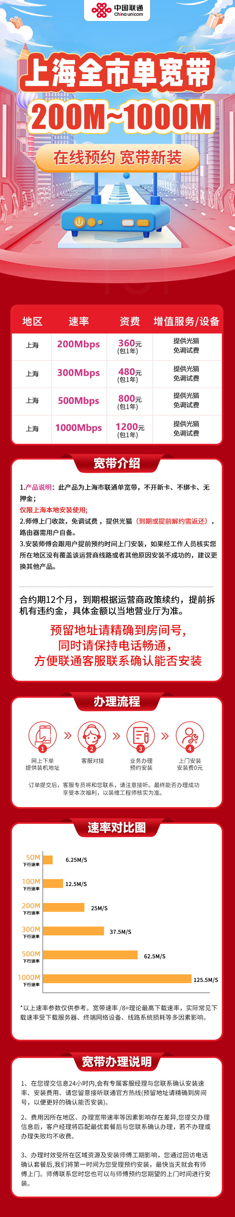 1.产品说明:此产品为上海全省联通单宽带,不开新卡、不绑卡、无押金;仅限上海本地安装使用2.师傅上门收款,免调试费。提供光猫(到期或提前解约需返还),路由器需用户自备。