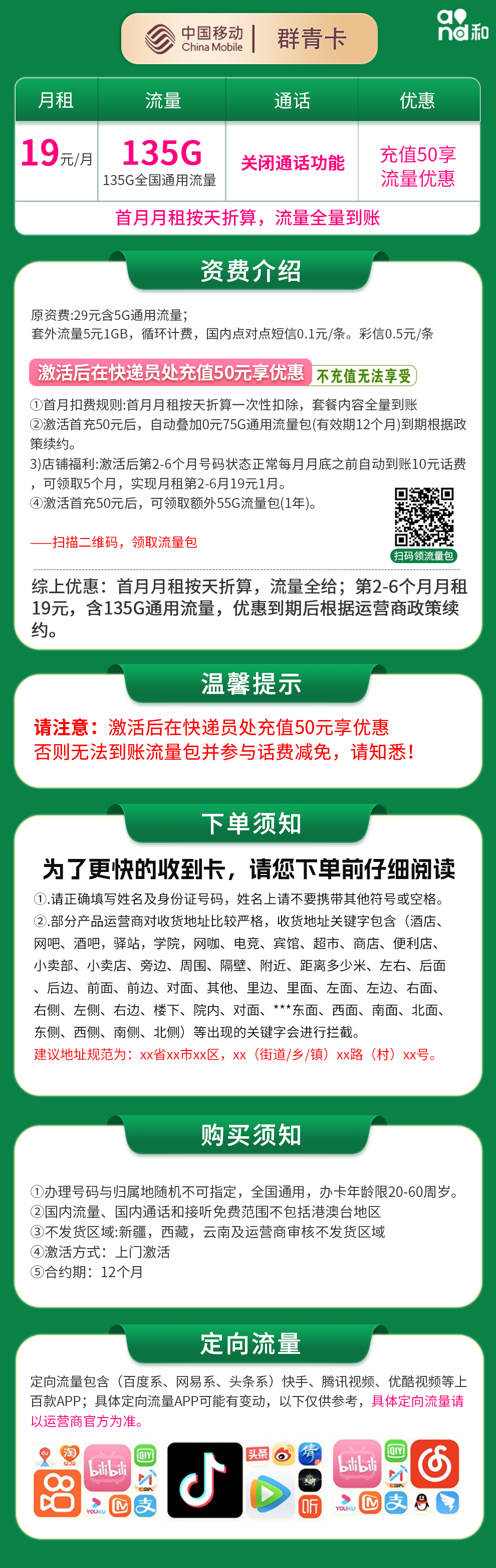 第2-6个月月租19元,含135G通用流量,优惠到期后根据运营商政策续约 - 定向流量: