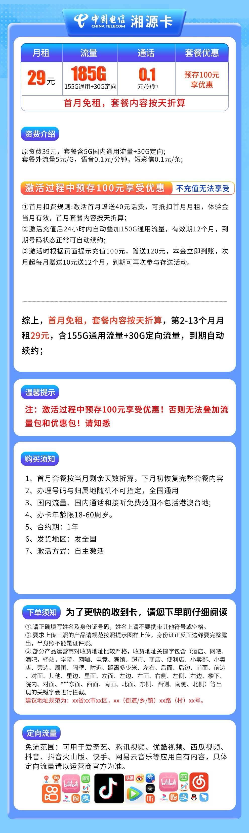电信湘源卡29元185G【发全国】