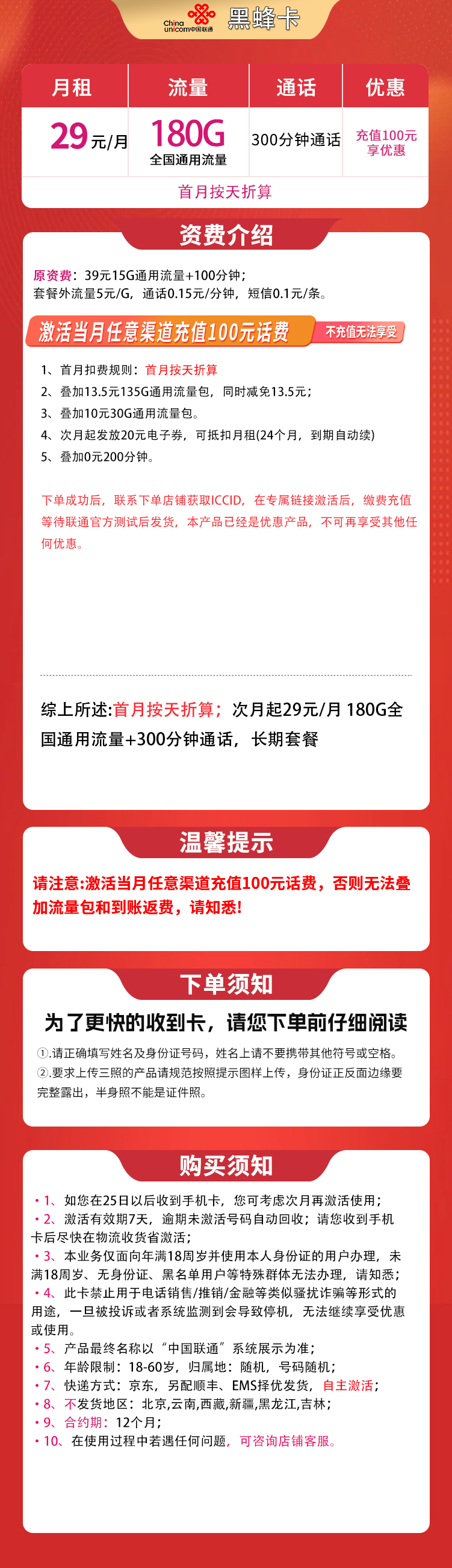 首月月租按天折算次月起29元/月180G全国通用流量+300分钟通话,长期套餐