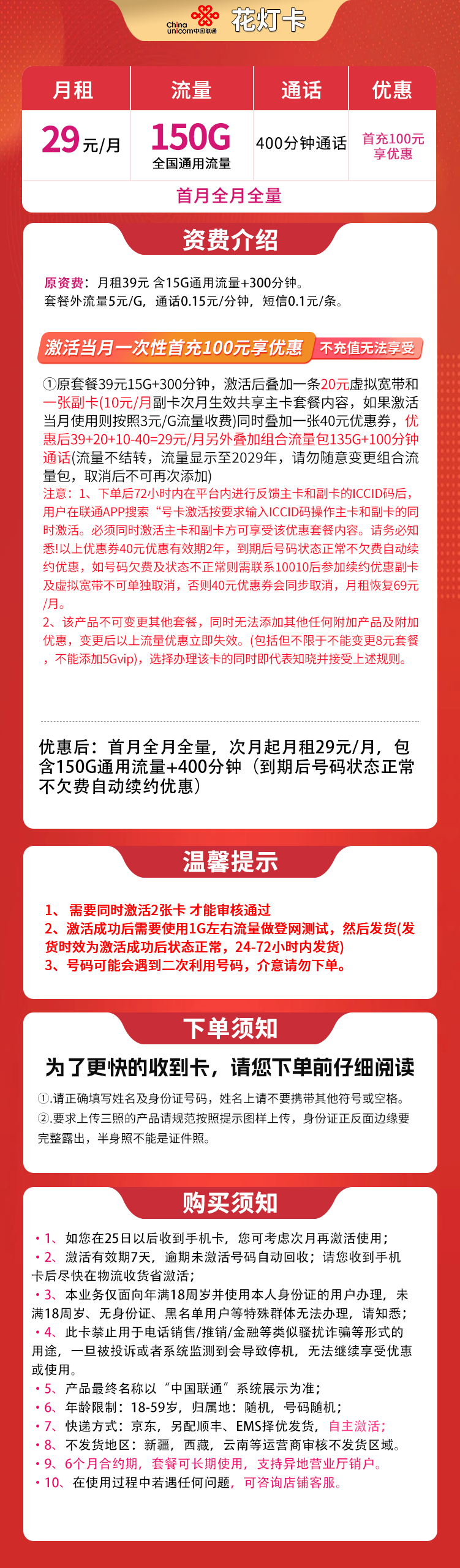 联通花灯卡29元150G+400分钟【发全国】