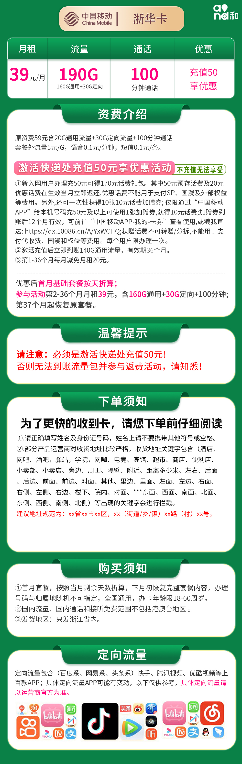 参与活动第2-36个月月租39元,含160G通用+30G定向+100分钟,第37个月起恢复原套餐。 - 定向流量: