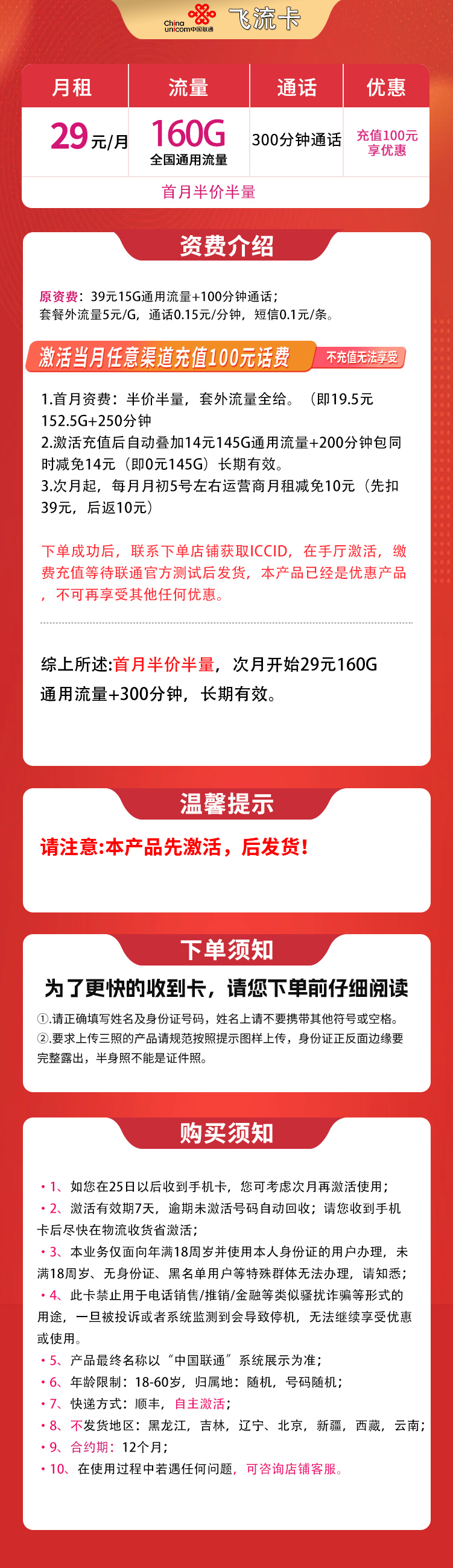 - 联通飞流卡:月租29元,包含160G全国通用流量和300分钟全国通话。