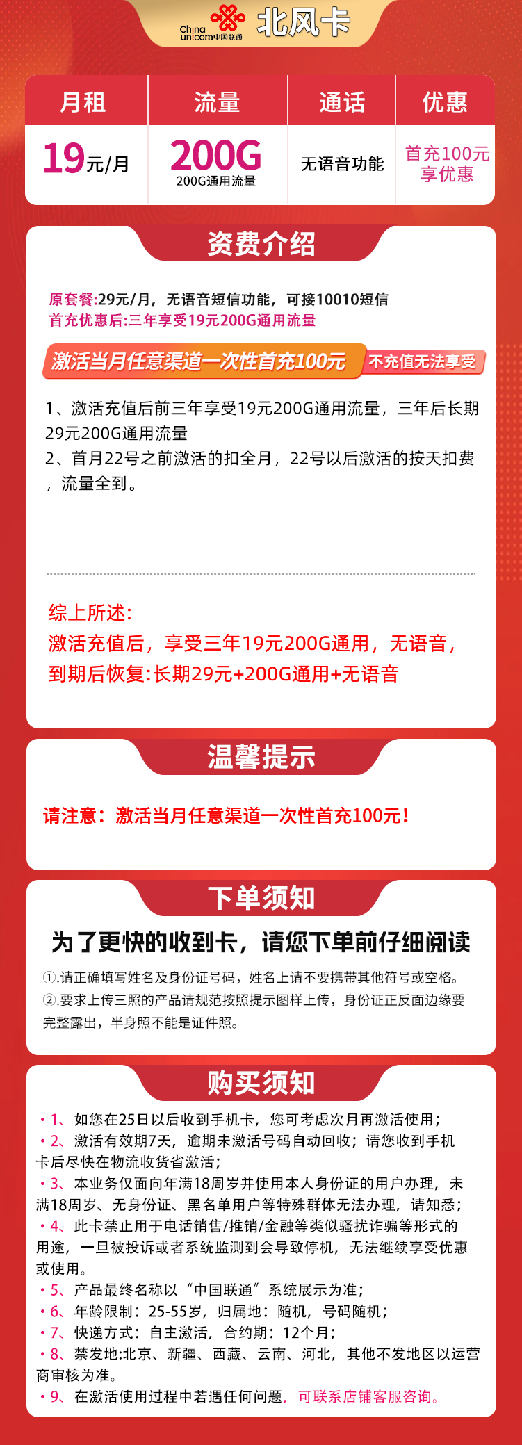 月费19元,含200G通用流量,适合大流量用户,性价比高。