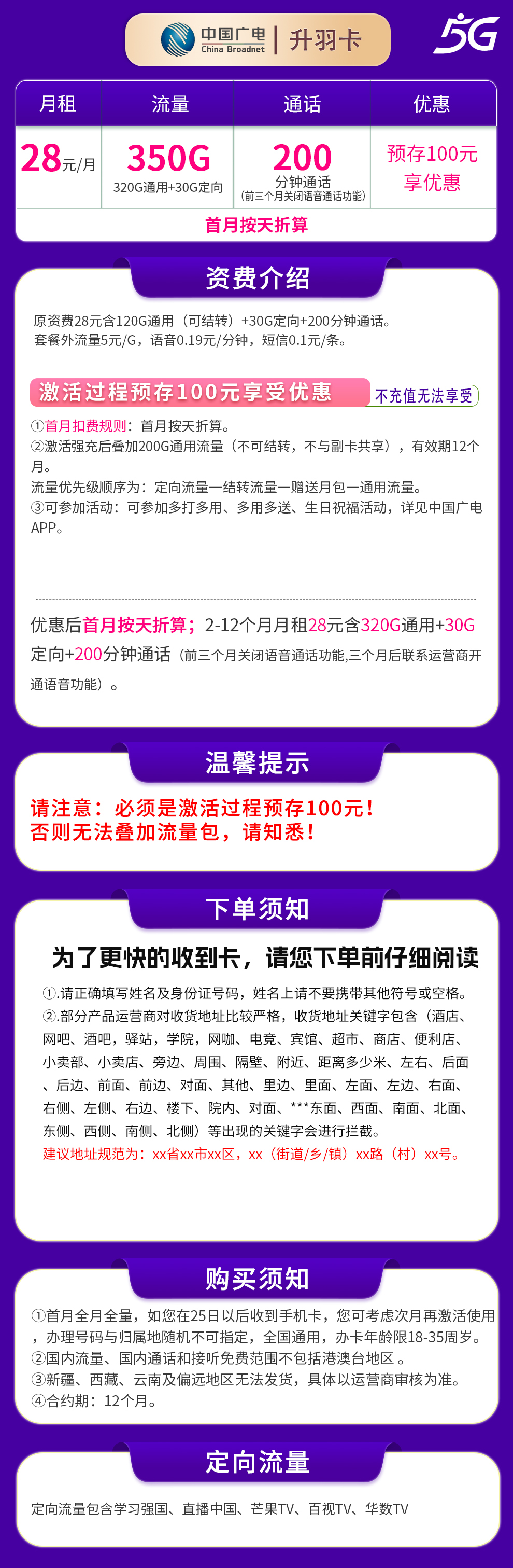 **一句话总结:** 预存100元,首月按天算钱,之后每月28元,能用350G流量(其中320G通用)和200分钟通话(需三个月后开通),优惠期一年。