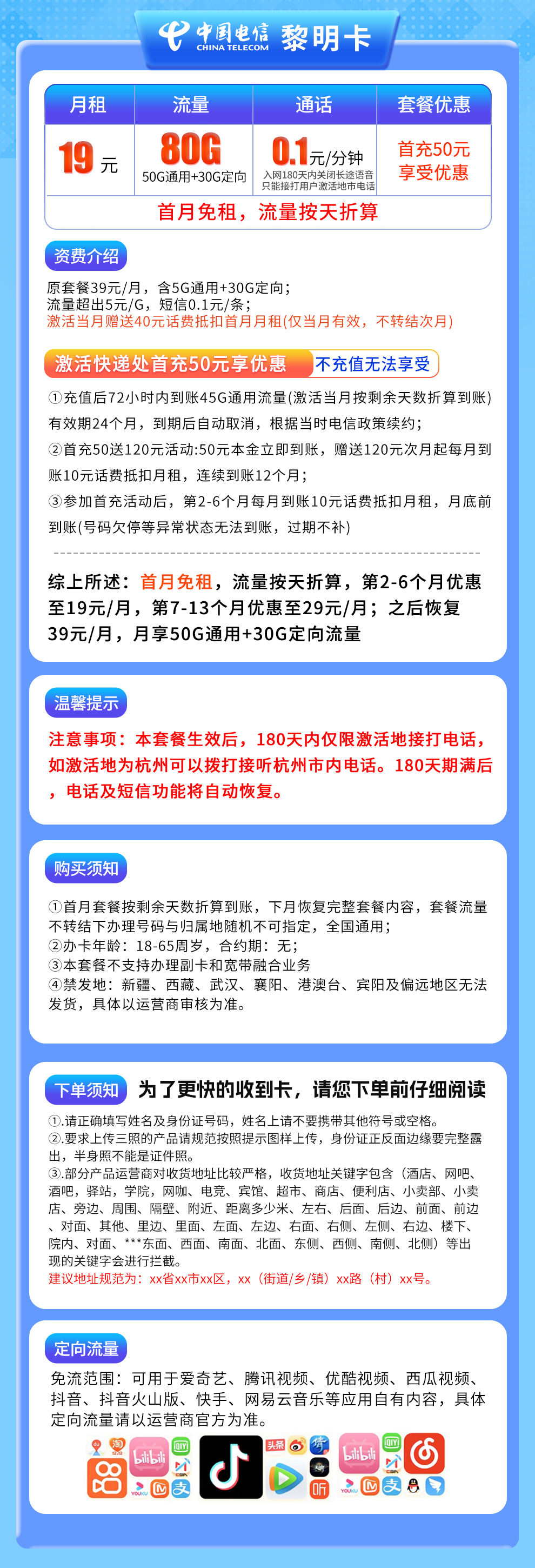 - 电信黎明卡:19元月租,含80G流量(50G通用+30G定向)。首月免费,第2-6个月19元/月,第7-13个月29元/月,之后恢复39元/月。需首充50元激活优惠,赠送话费分月抵扣。前180天有通话地域限制。