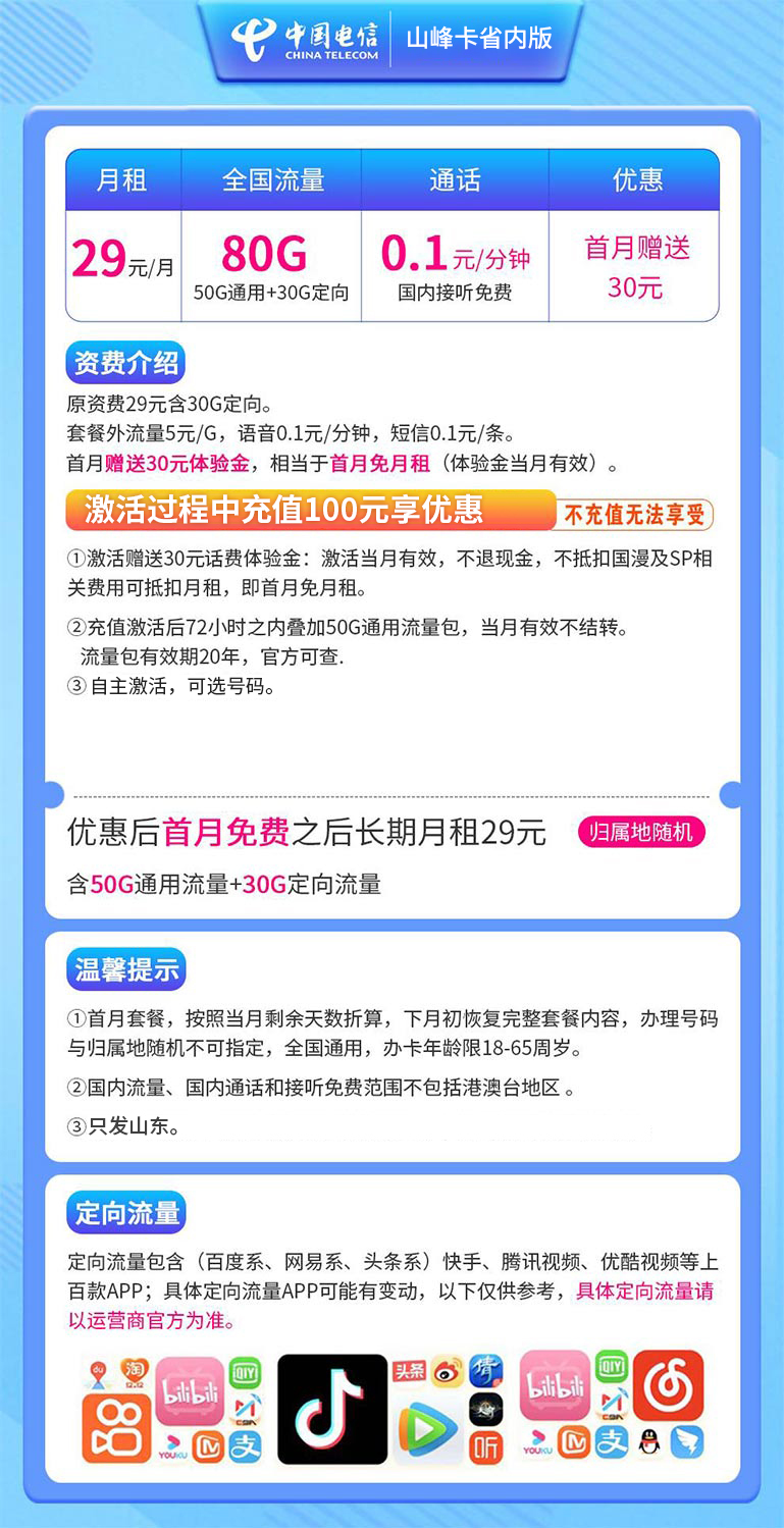 【电信山峰卡】29元月租,含80G流量(仅限山东地区办理)。