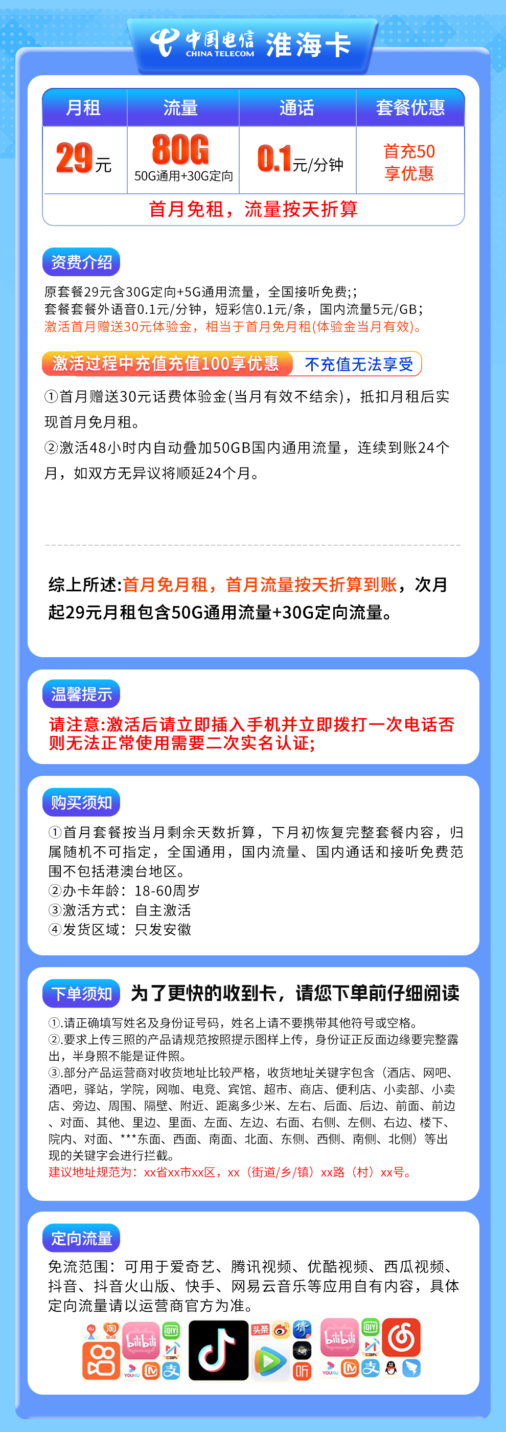 - 电信淮海卡29元套餐,仅限安徽办理。激活时需要先充100元,首月免月租,流量按天折算。从第2个月到第24个月,每月29元,包含30G定向流量和50G通用流量,外加0.1分钟通话。通用流量当月有效,不能结转到下个月,到期后自动续约一次。