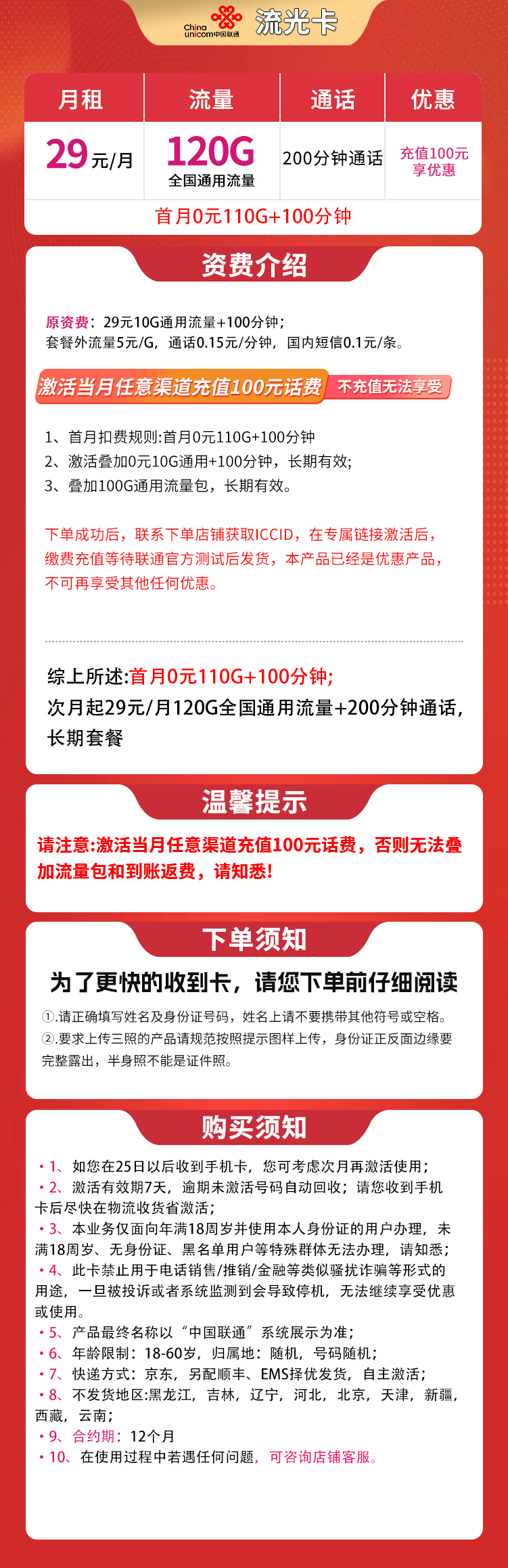 - 联通流光卡:首月免费110G流量+100分钟通话,次月起每月29元,享120G全国通用流量+200分钟通话,长期有效。激活需先充值100元话费。
