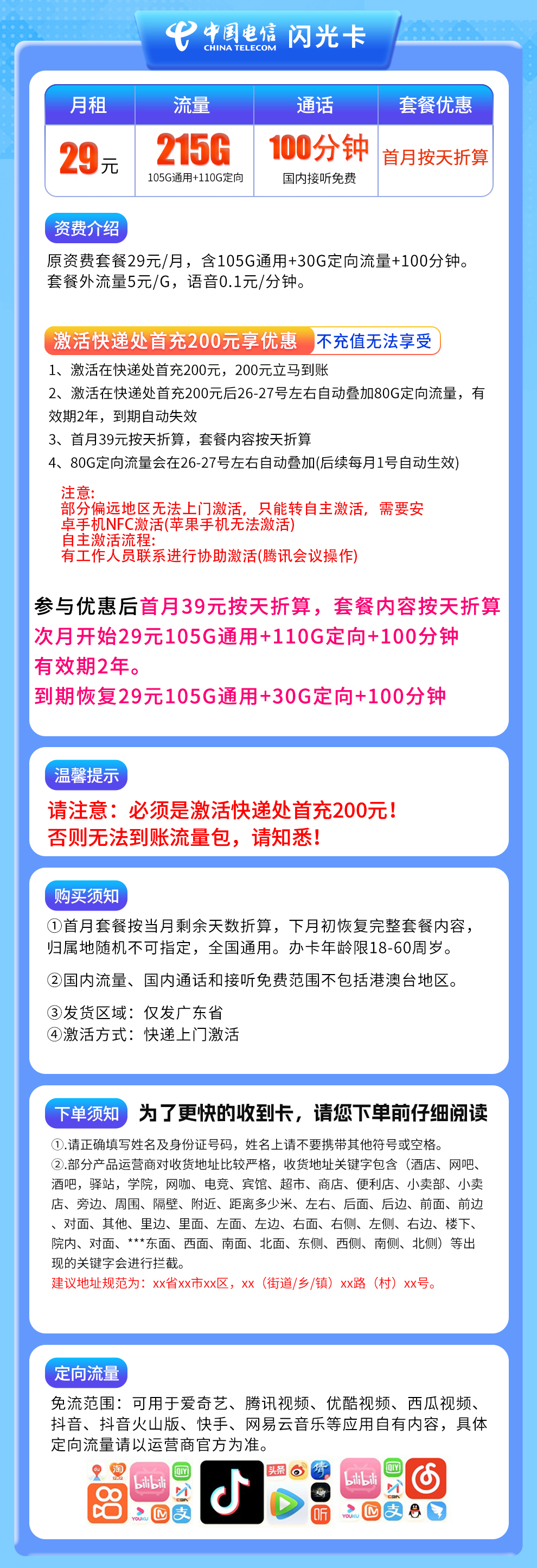 【电信闪光卡】29元月租,含215G流量+100分钟通话,仅限广东地区办理。
