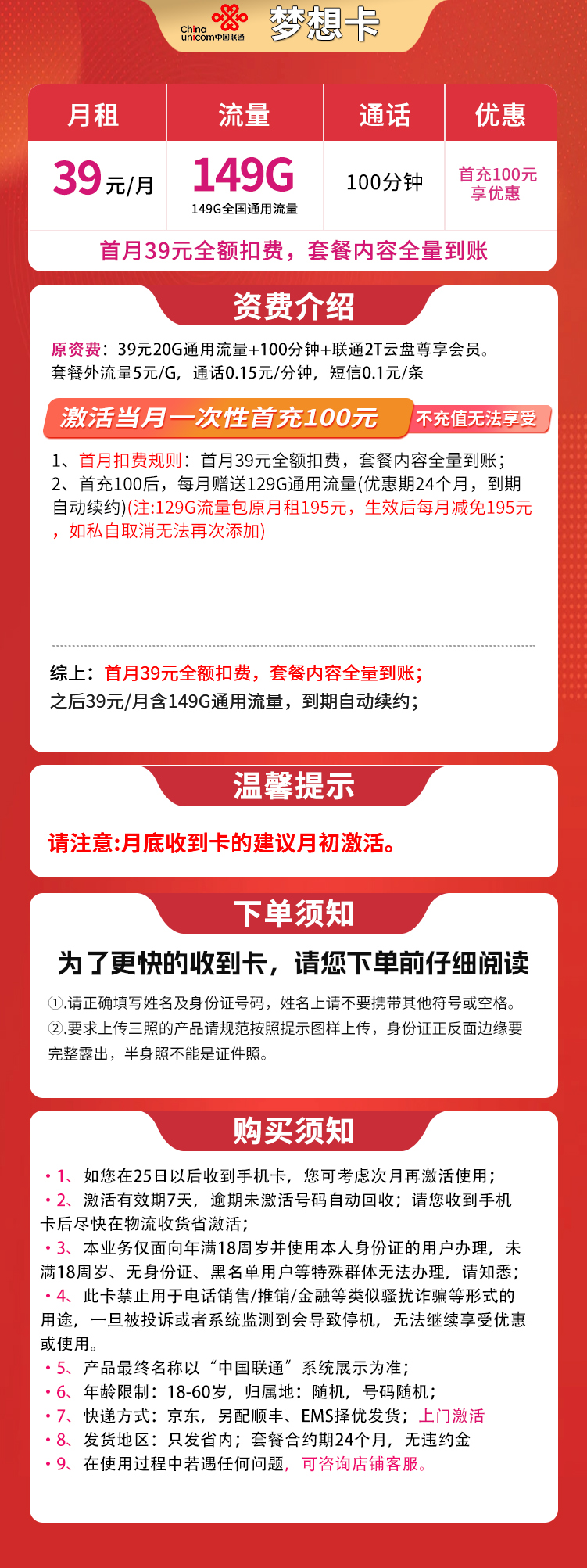 - 联通梦想卡39元套餐:首月39元,之后每月39元,含149G通用流量+100分钟通话(省内使用)。需首充100元激活优惠,优惠期24个月,到期自动续约。注意:129G流量包原价195元,优惠后减免,不可私自取消。
