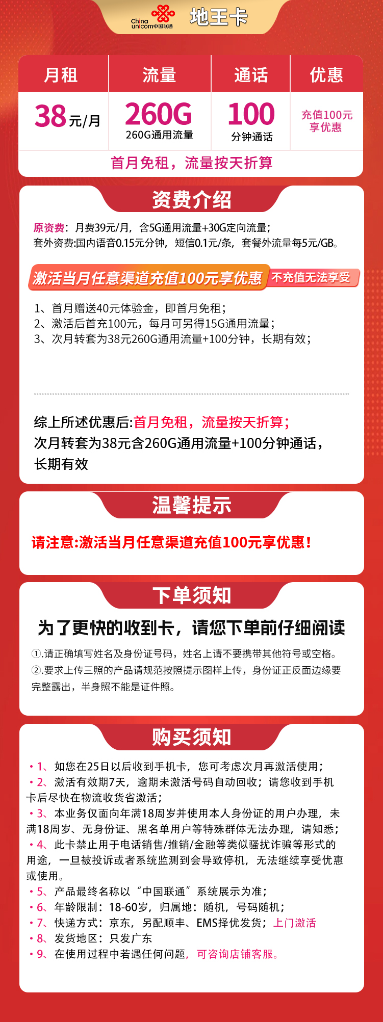 次月起每月38元,得260G流量+100分钟通话,另加每月15G通用流量(需首充100元)。