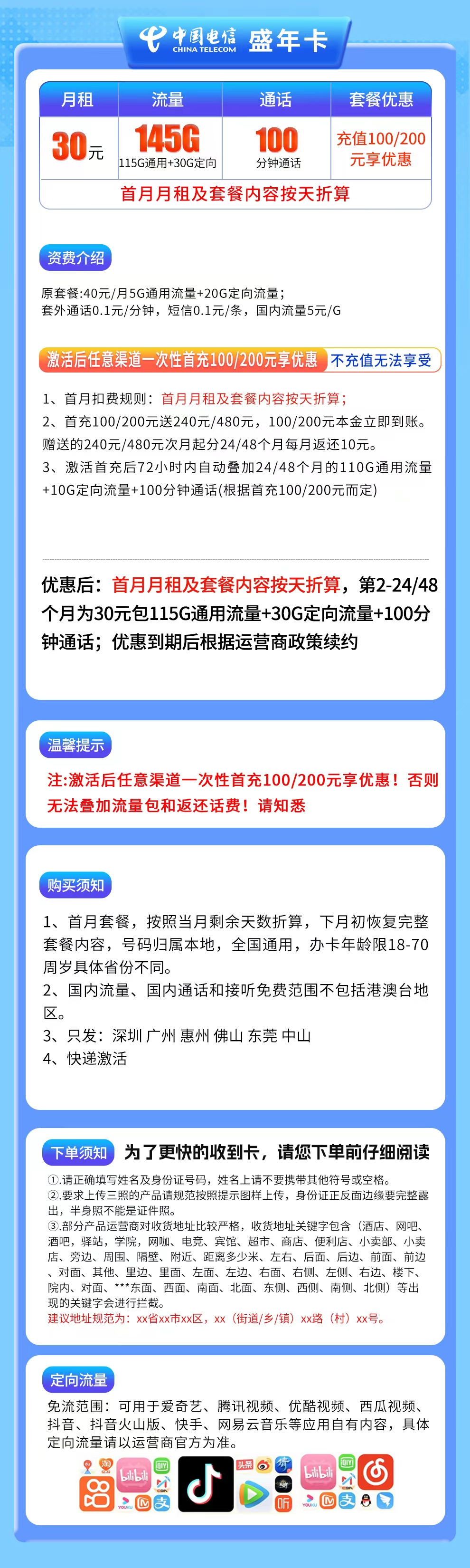 - 广东6市可办电信盛年卡,月租30元,含145G流量(115G通用+30G定向)+100分钟通话。首充100元或200元后,次月起分24或48个月每月返还10元,相当于长期优惠。