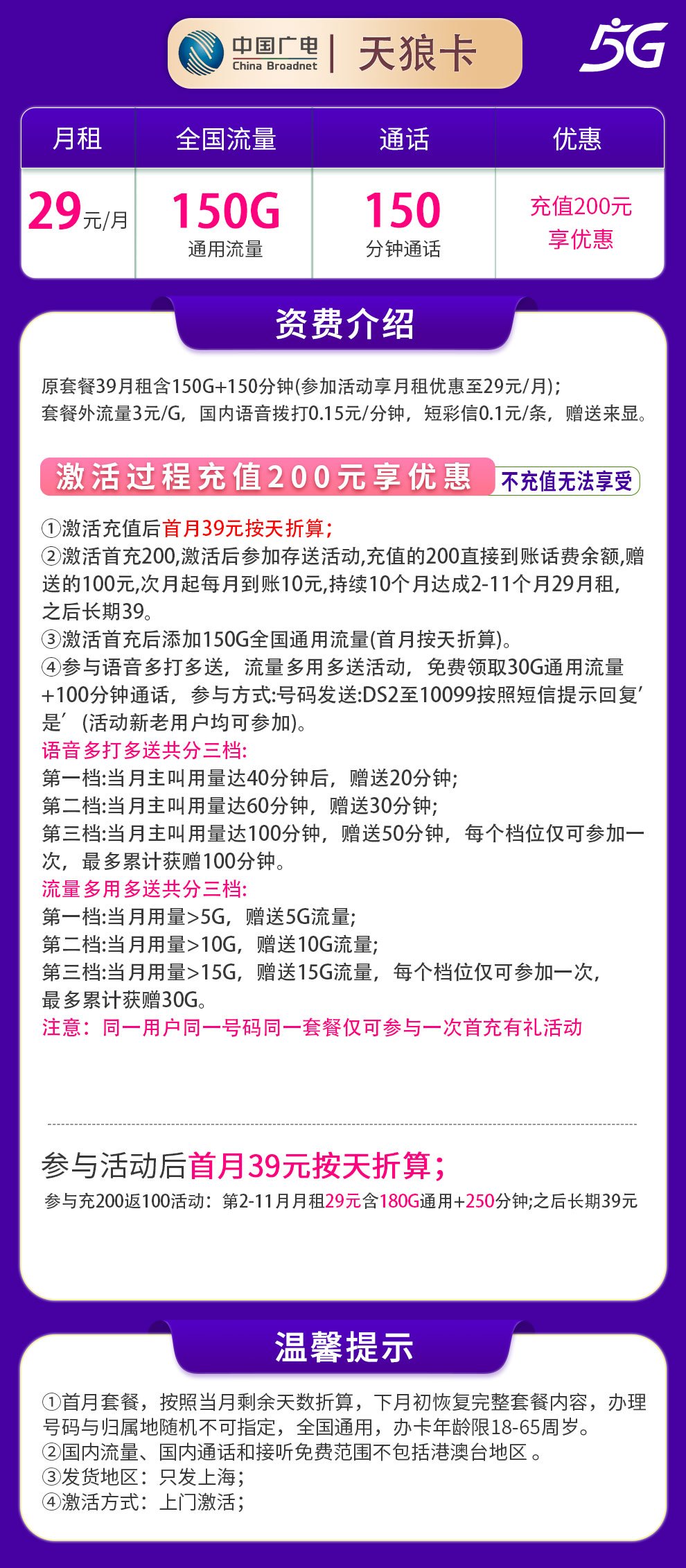 广电天狼卡:29元月租,含150G流量和150分钟通话,仅限上海地区办理。
