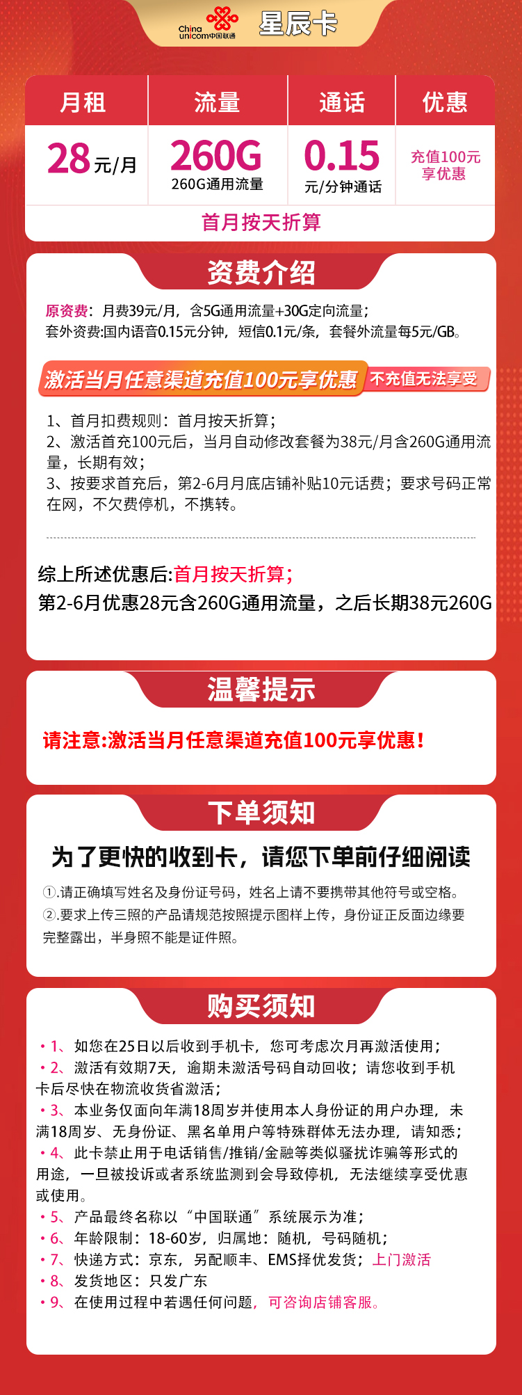 - 联通星辰卡28元套餐,每月包含260G通用流量,仅限广东地区办理。