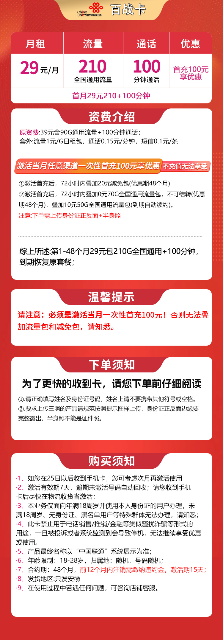 - 【联通百战卡29元套餐】安徽用户专享,首充100元后,前48个月每月29元得210G全国流量+100分钟通话。需上传身份证及学生相关证件办理。