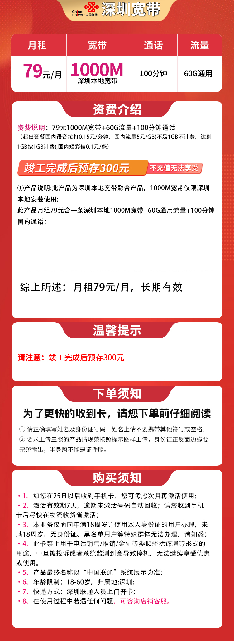 深圳融合宽带79元60G+100分钟+1000M【含1000M宽带】