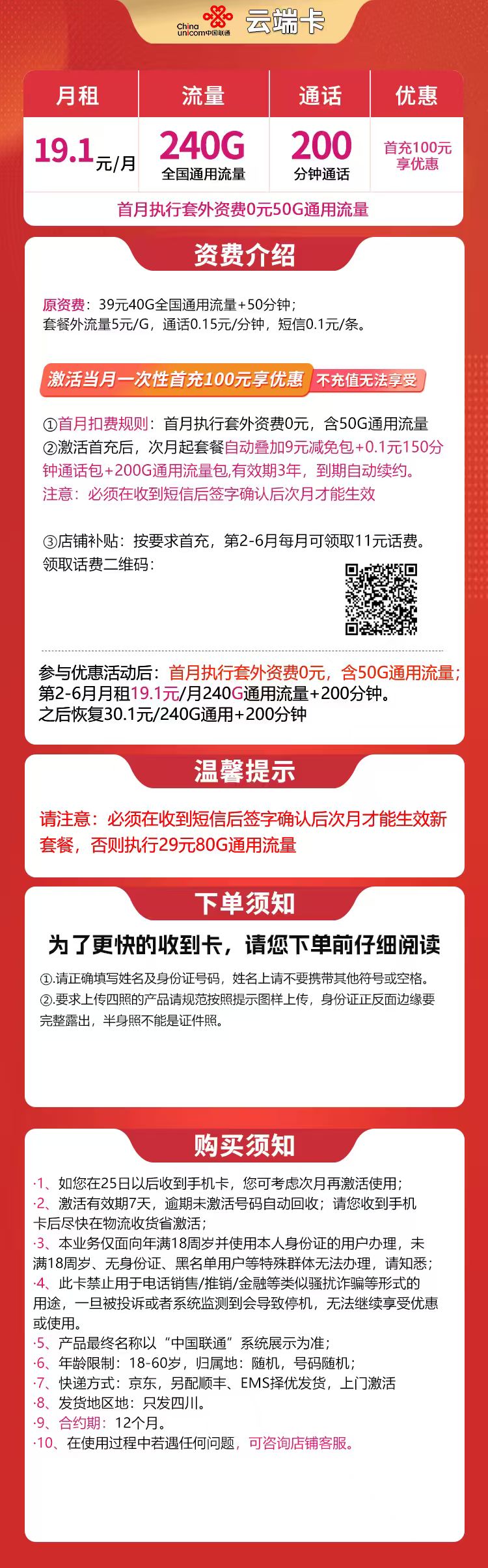 - 联通云端卡:19.1元月租,包含240GB全国流量和200分钟通话,限四川地区办理。