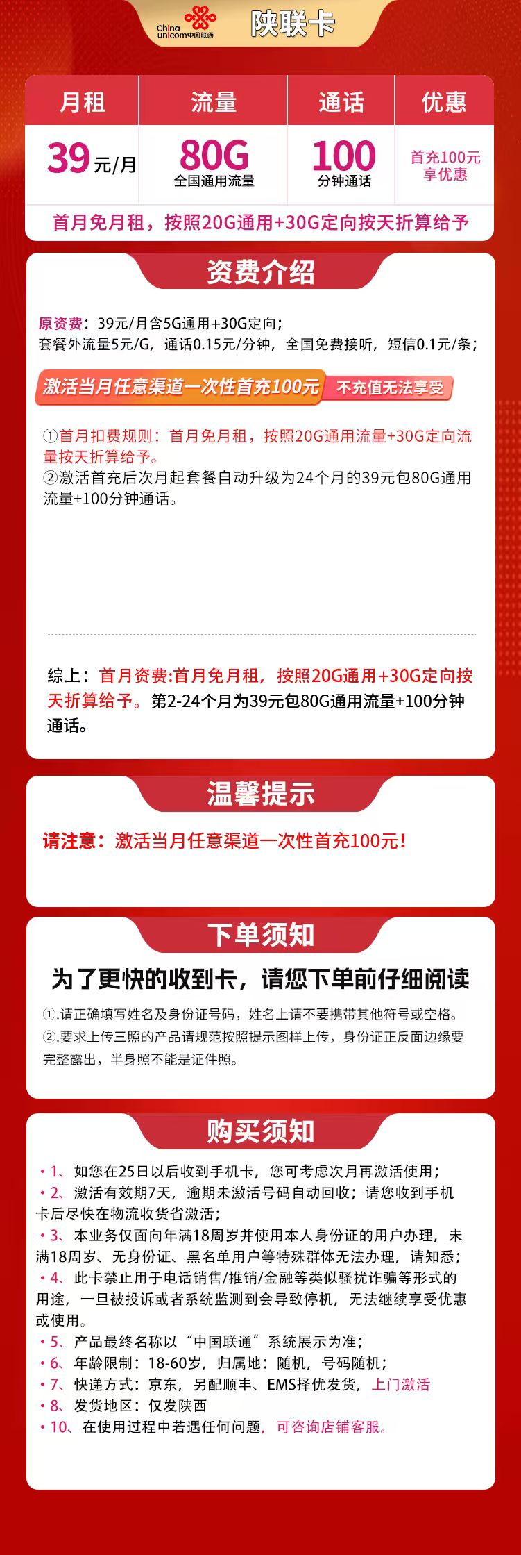 - 陕西用户专享:联通陕联卡,月租39元,包含80GB流量和100分钟通话,仅限陕西地区办理。