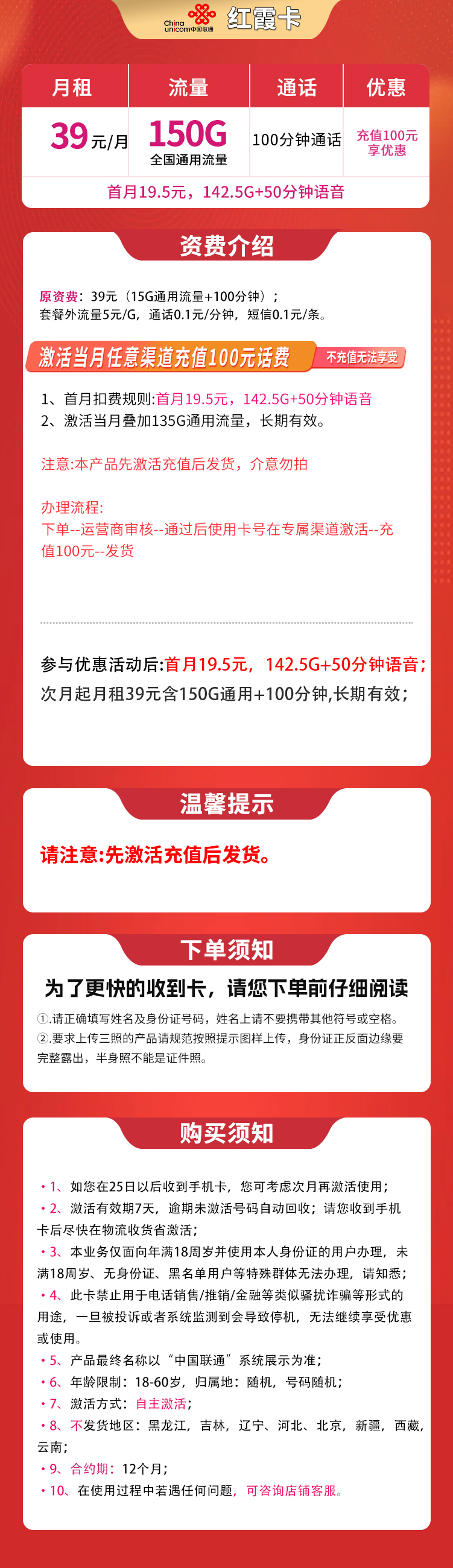 2. **注意流程**:这个卡比较特殊,是 **“先激活充值,后发货”**。下单审核通过后,你会先拿到卡号,在指定渠道激活并充值100元,运营商才会把实体卡寄给你。如果介意这个流程,不要办理。