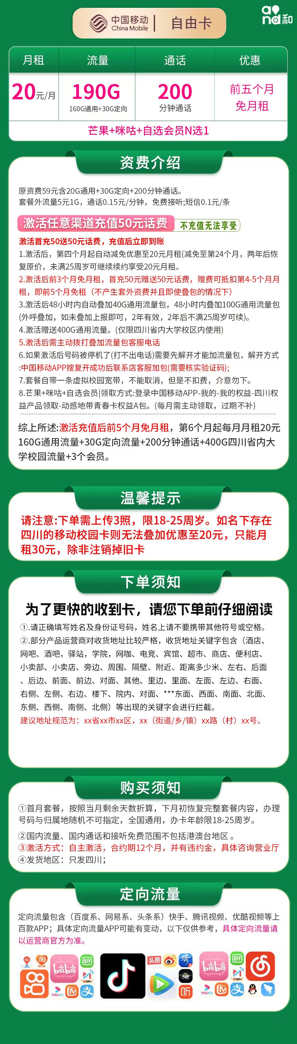 - 移动自由卡20元套餐(限四川):