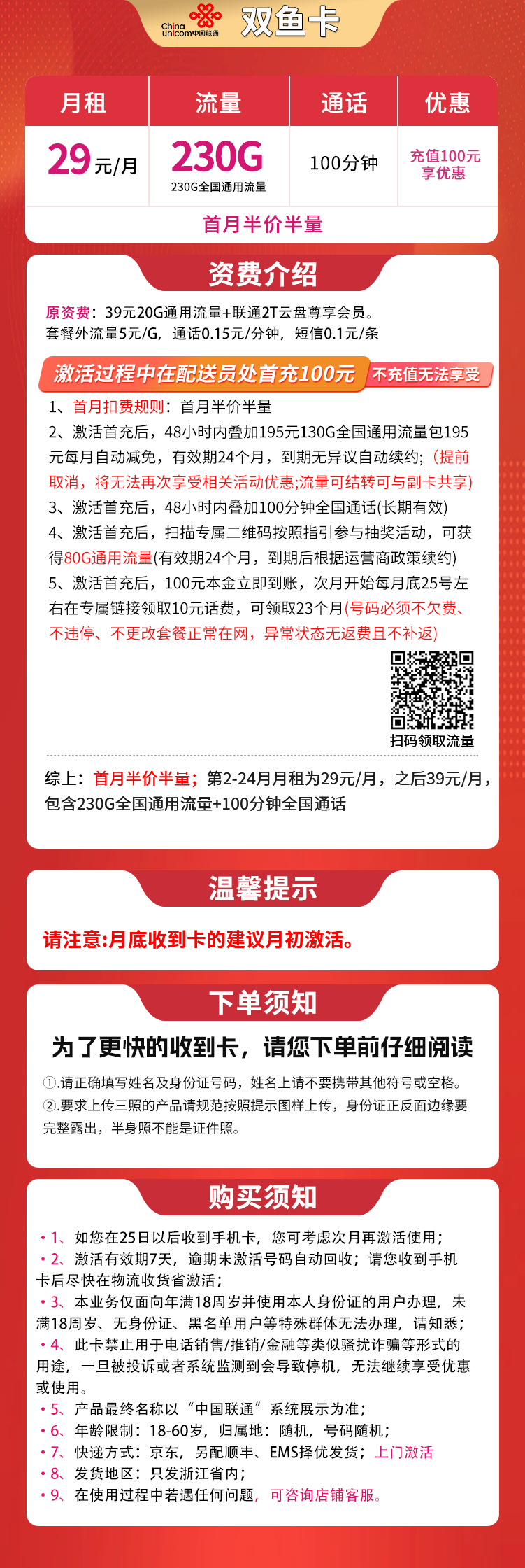 - 首月半价半量,之后29元/月,含230G通用流量+100分钟通话,优惠期24个月。