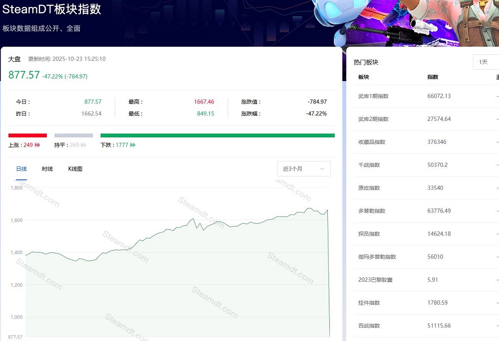 可以看到CS2饰品大盘指数和刀皮指数在消息发布后瞬间暴跌,要知道steam上的刀手套库存是非常多的,很多还有库存的小伙伴哭晕了,而且对市场波动影响巨大。