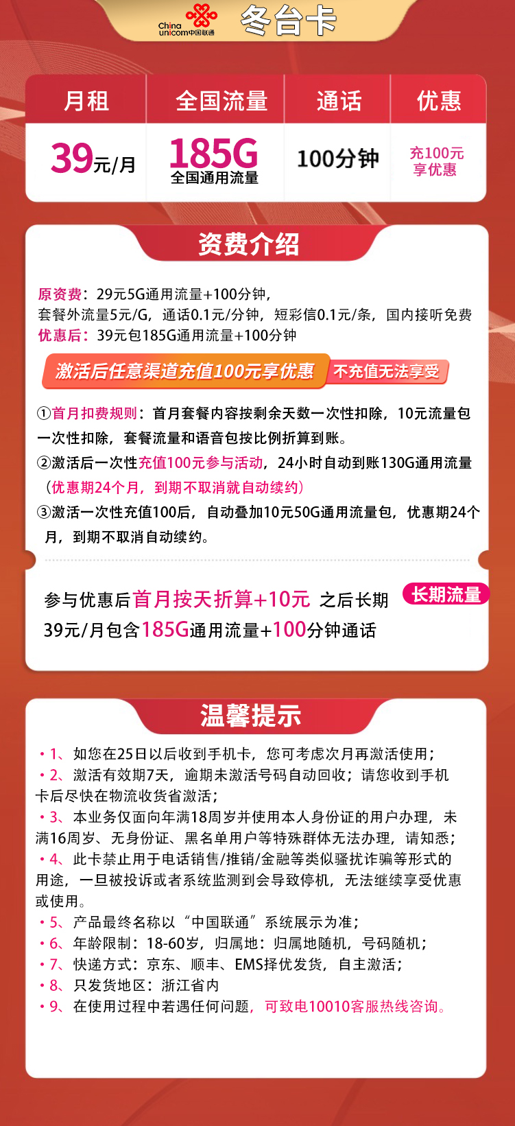 - 联通冬台卡,39元月租,包含185G通用流量和100分钟通话。仅限浙江地区办理。