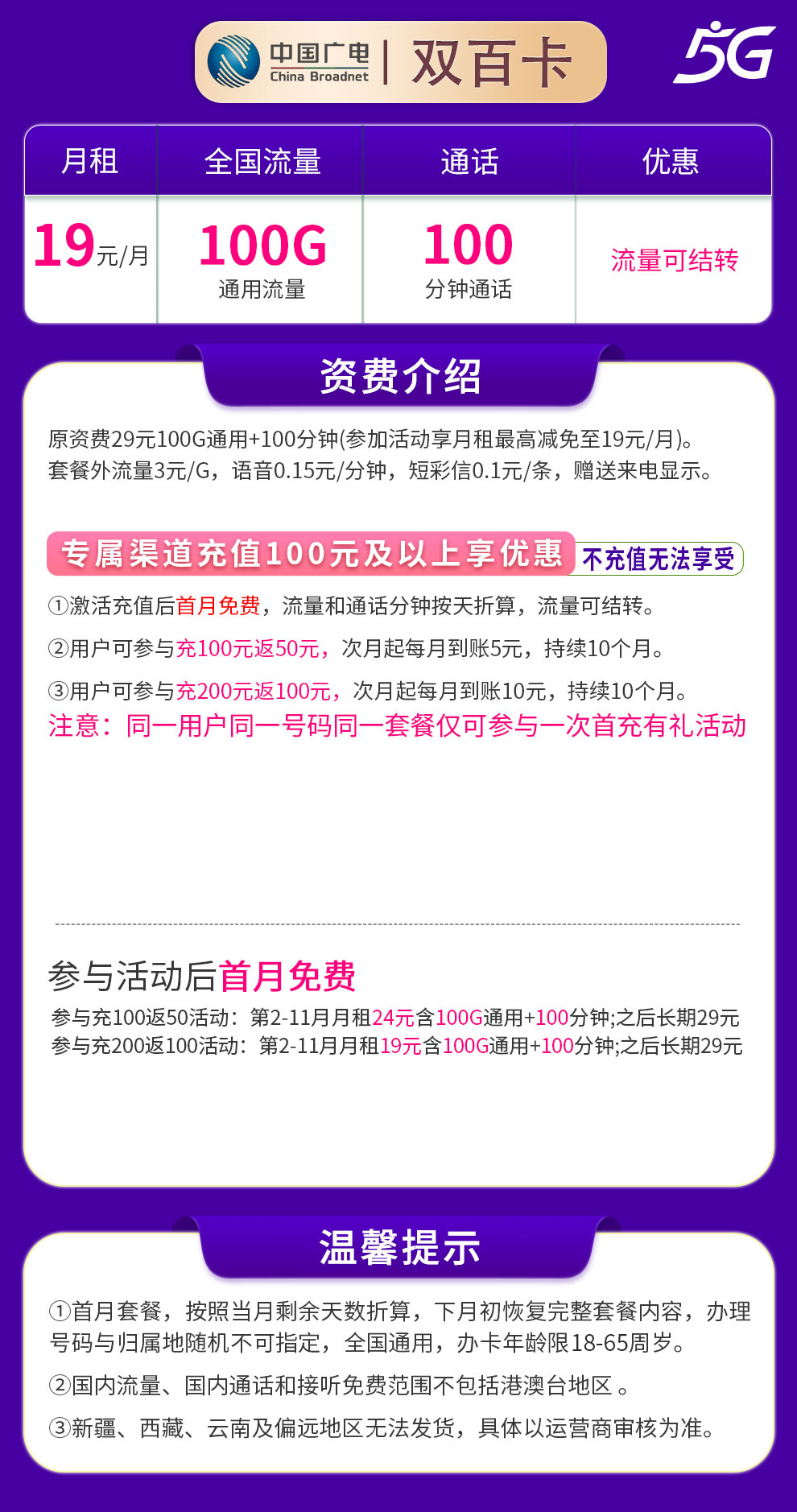 G2广电双百卡19元100G+100分钟【发全国】