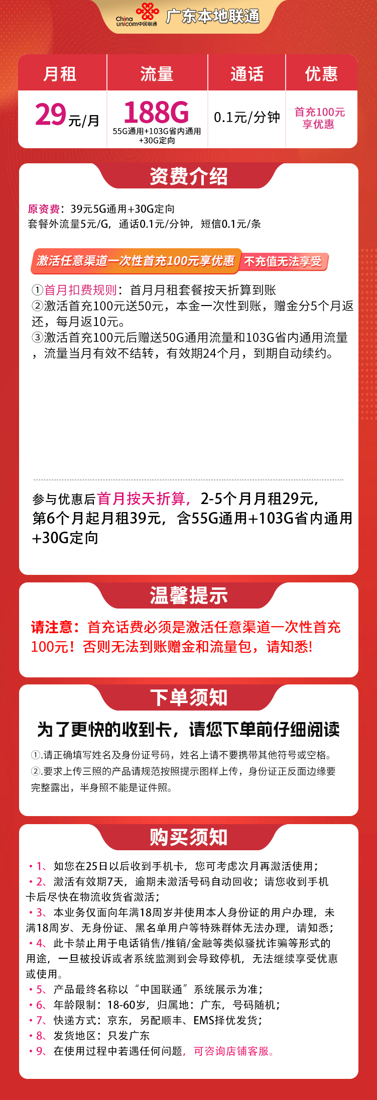 广东本地联通29元188G【只发广东】
