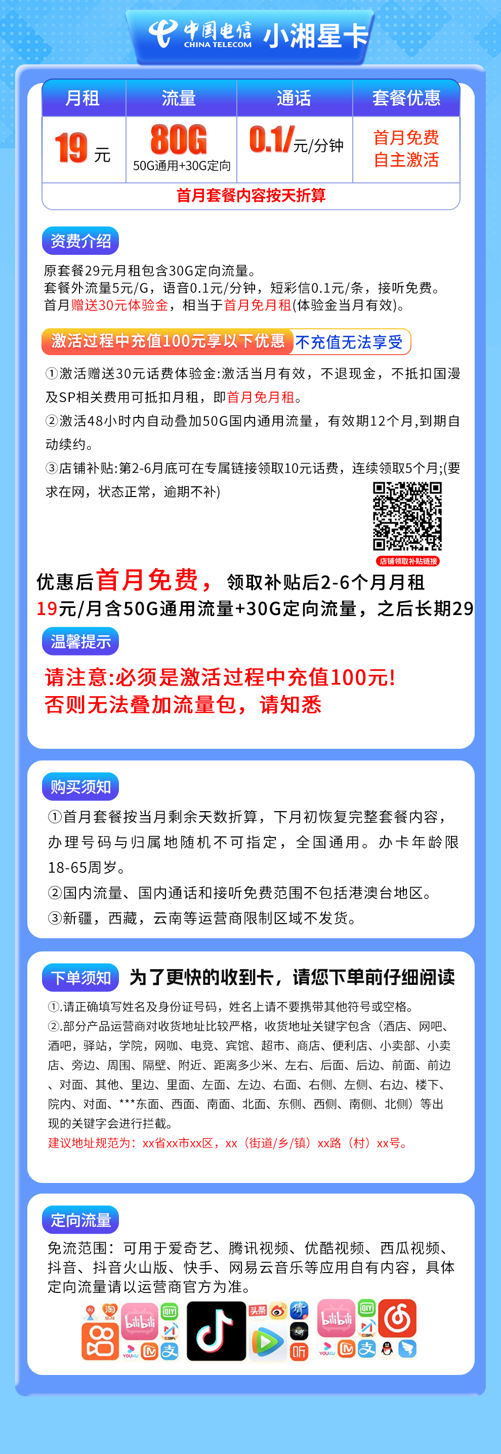 电信小湘星卡19元80G【发全国】