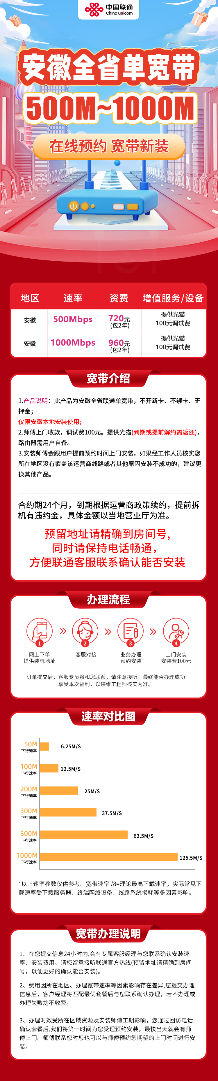 1.产品说明:此产品为安徽全省联通单宽带,不开新卡、不绑卡、无押金;仅限安徽本地安装使用
