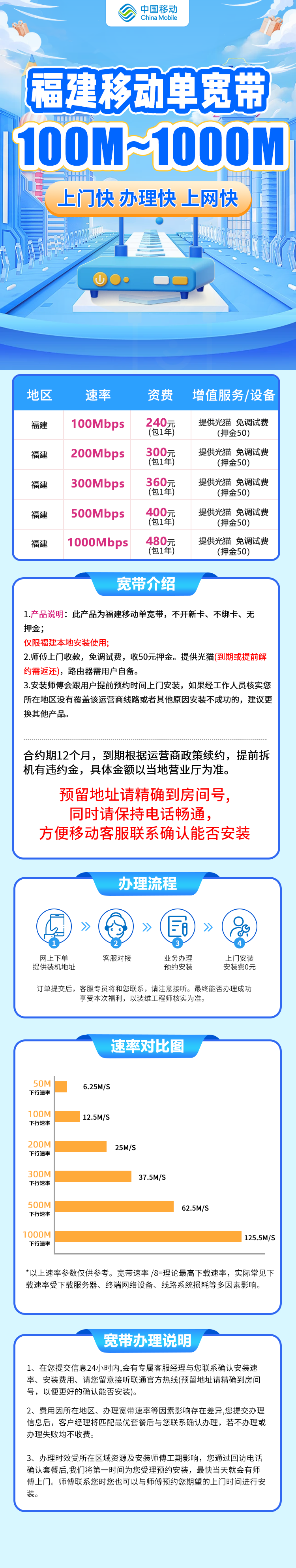1.产品说明:此产品为福建全省移动单宽带,不开新卡、不绑卡、无押金;仅限福建本地安装使用2.师傅上门收款,免调试费。提供光猫,押金50元(到期或提前解约需返还),路由器需用户自备。