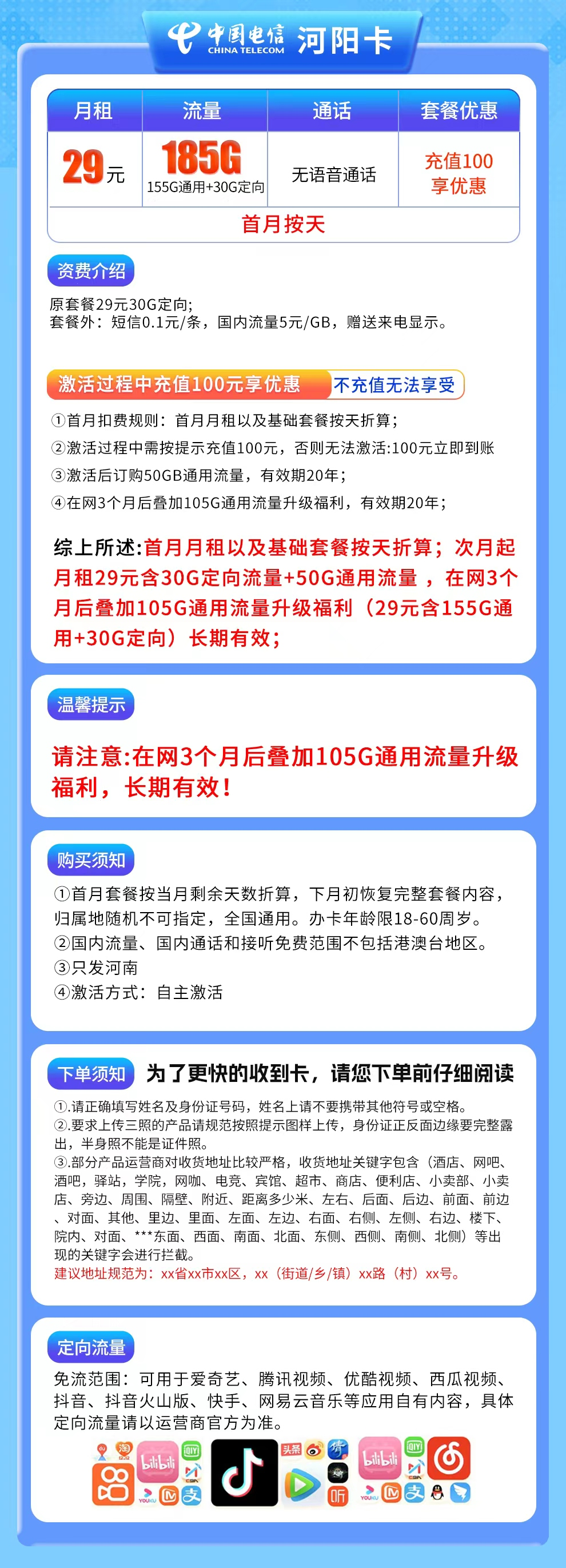 次月起月租29元含30G定向流量+50G通用流量,在网3个月后叠加105G通用流量升级福利(29元含155G通用+30G定向)长期有效 - 定向流量: