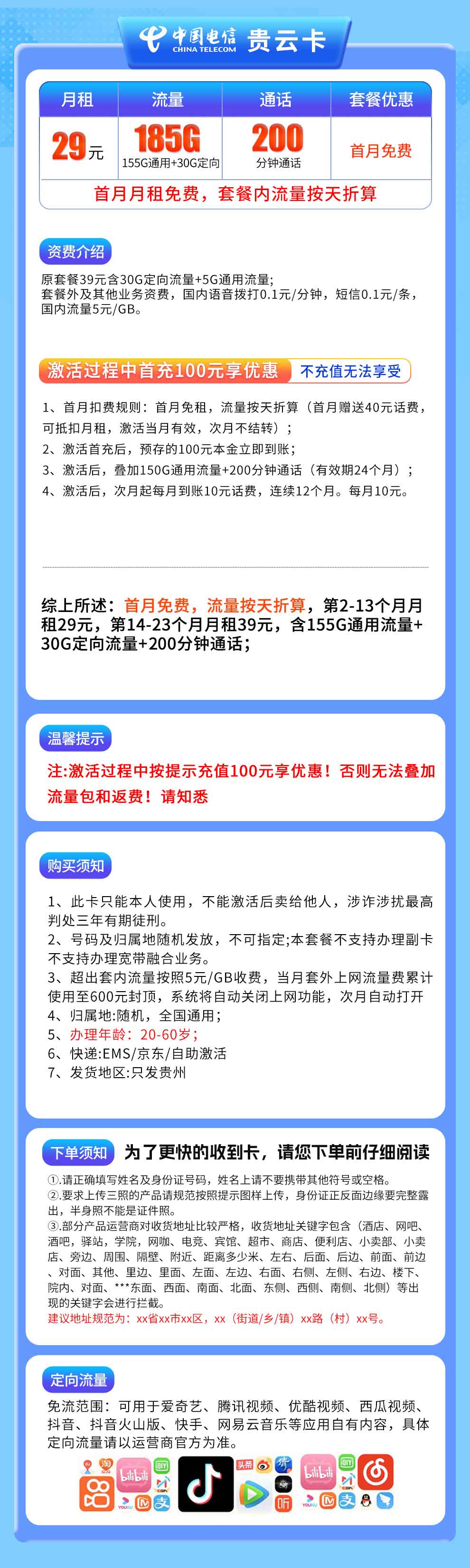 - 【电信贵云卡29元套餐】只限贵州办理