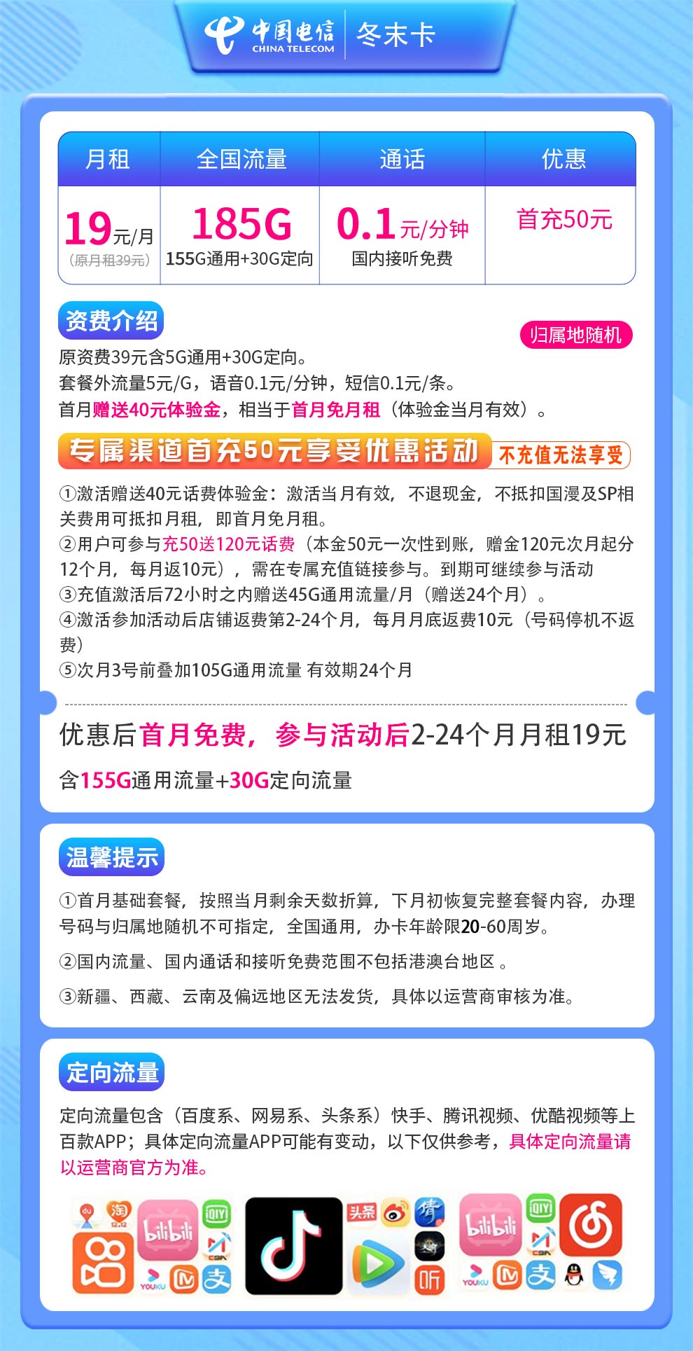- 【电信冬末卡】19元月租