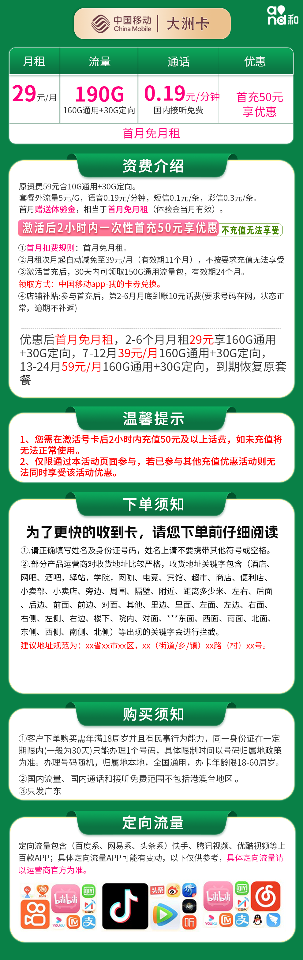 简单说:前半年很划算,29元190G流量,后半年开始涨价,两年后恢复原价。适合短期流量需求大的用户。