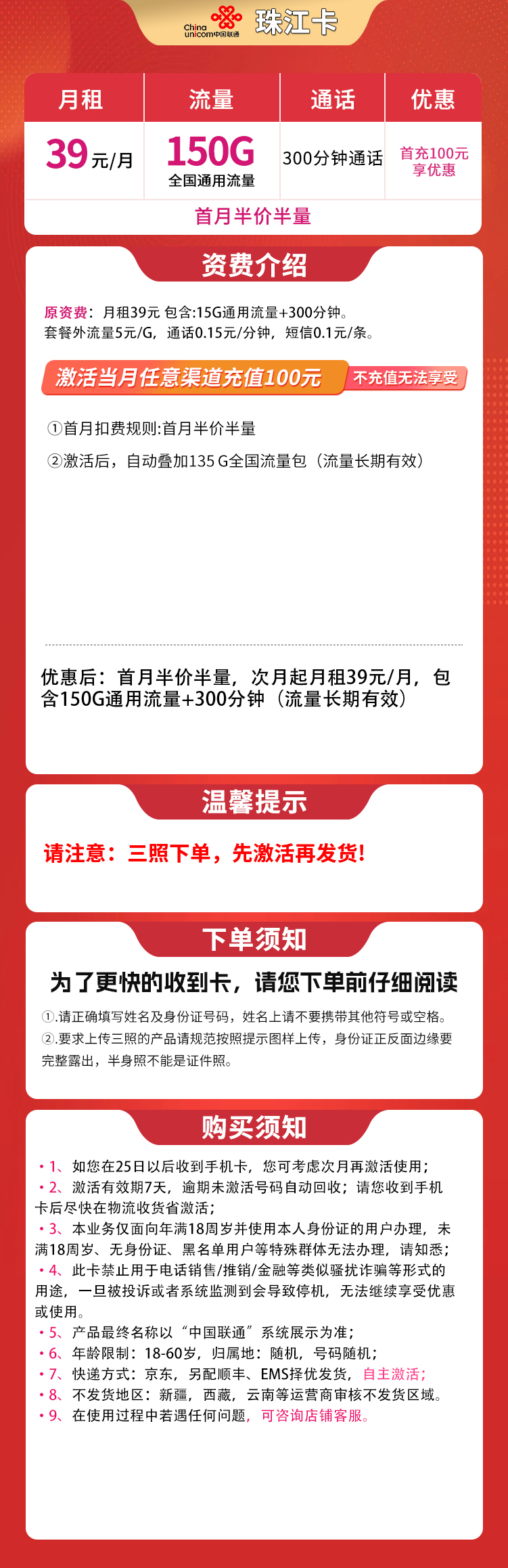 联通珠江卡39元150G+300分钟【发全国】