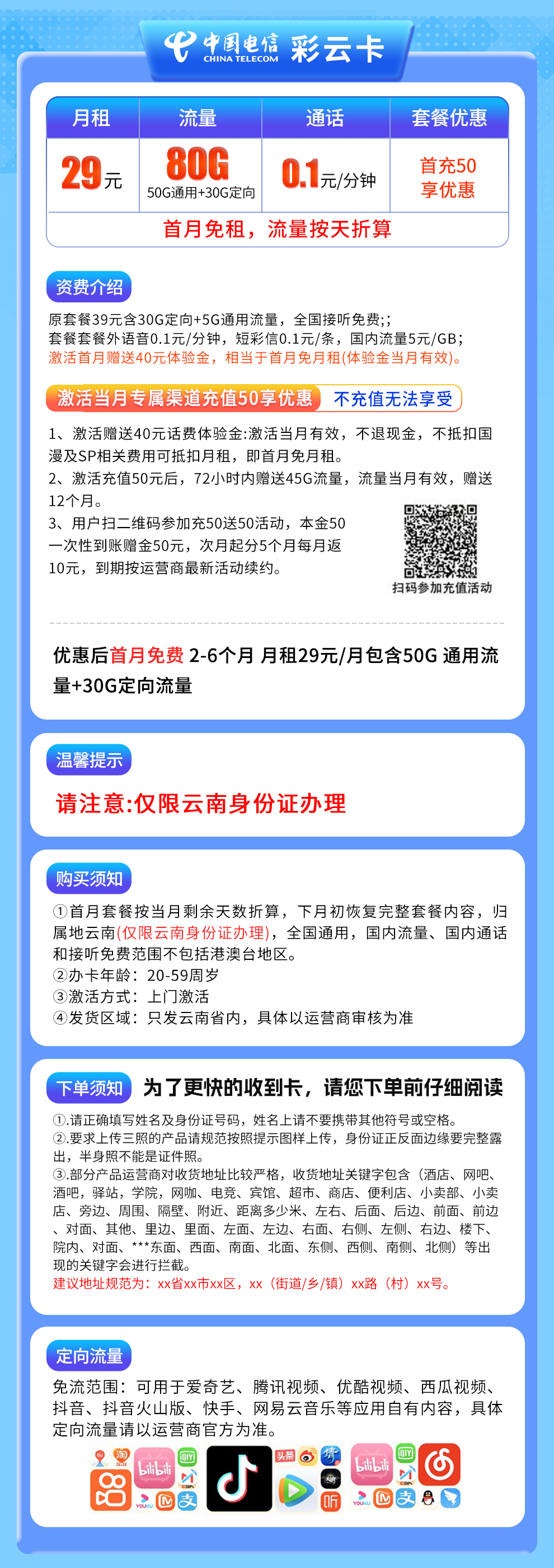 - 电信彩云卡29元套餐(限云南):
