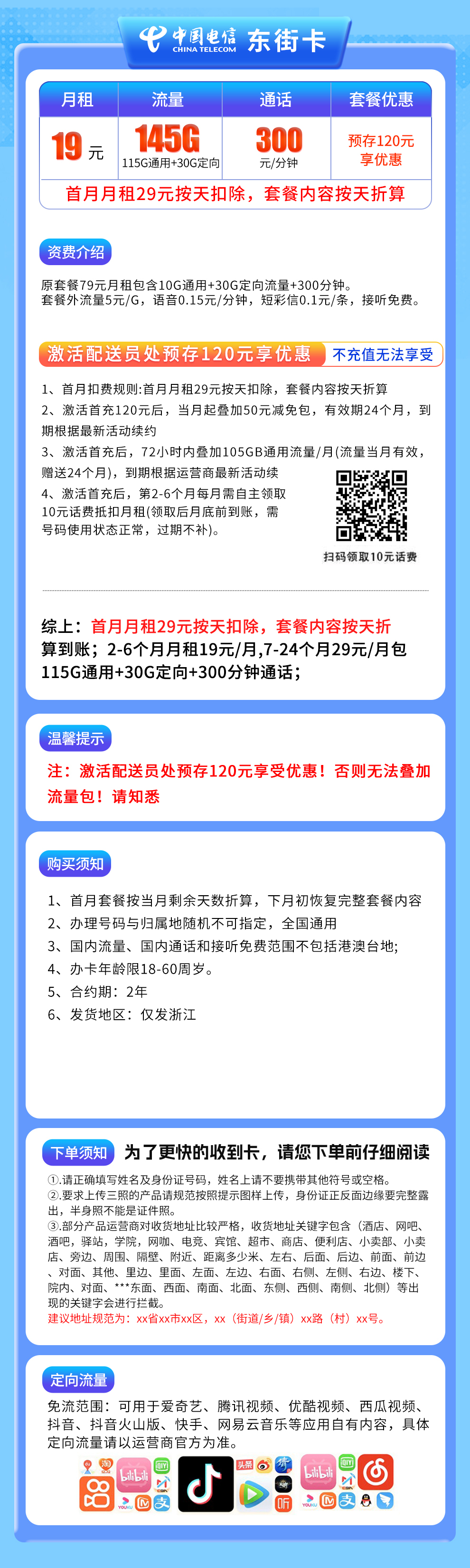 - 电信东街卡,19元月租,但注意几个关键点: