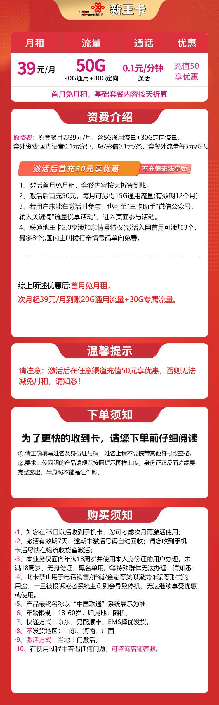 联通新王卡39元50G【发全国】