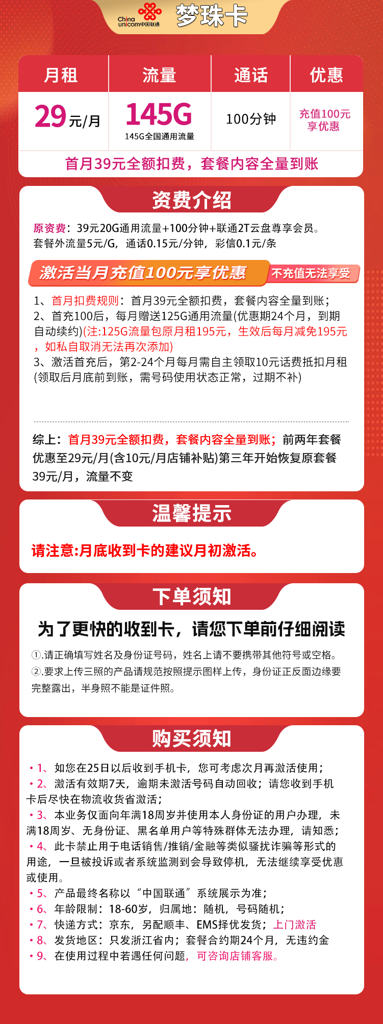 - 联通梦珠卡:29元月租,含145G省内流量和100分钟通话,适合省内使用。